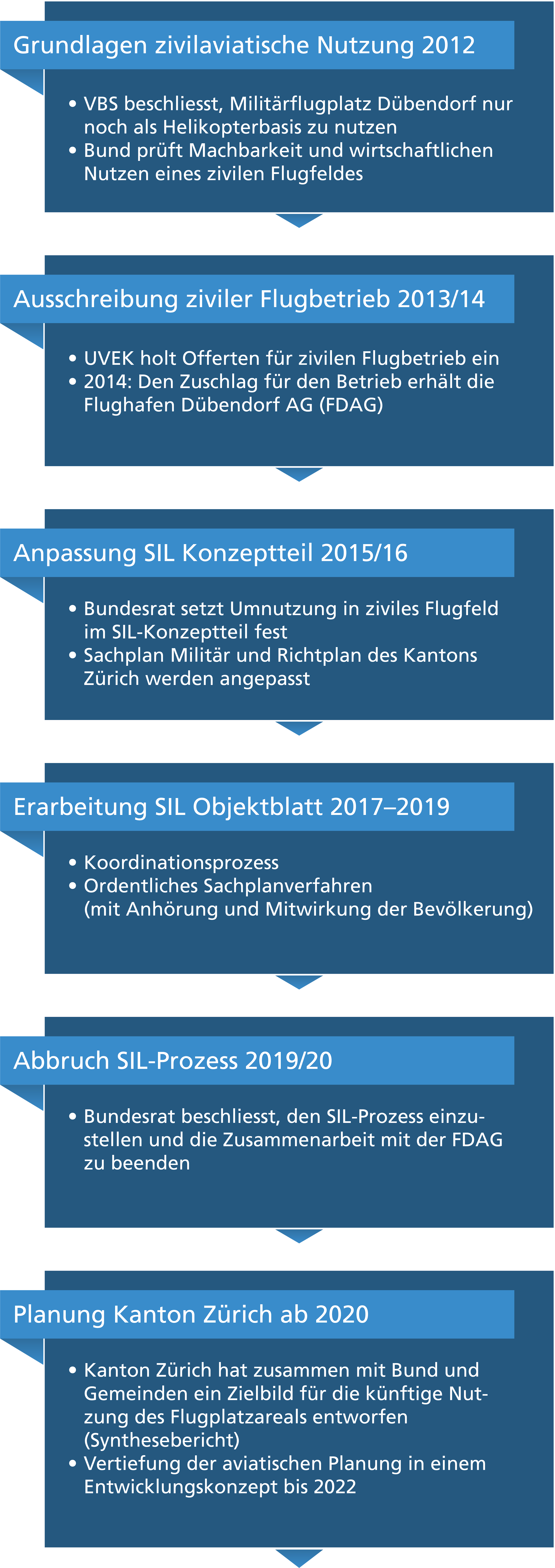 Der Bundesrat hatte 2014 beschlossen, den Militärflugplatz Dübendorf künftig als ziviles Flugfeld zu nutzen. Nachdem im Verlauf der Planungsarbeiten unvorhersehbare Probleme aufgetaucht sind und sich die Ausgangslage dadurch verändert hat, entschied der Bundesrat im Oktober 2020 das laufende Sachplanungsverfahren einzustellen. In der Folge hat der Kanton Zürich die Planung des gesamten Flugplatzareals neu aufgegleist.