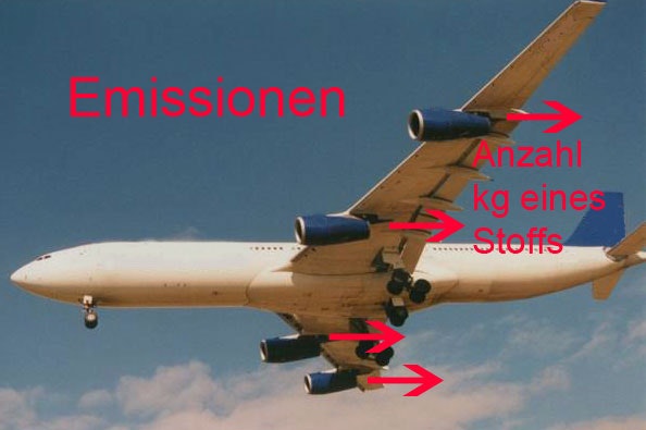 Emissionen sind Stoffe, die eine Quelle, beispielsweise ein Flugzeugtriebwerk, ausstösst. Diese Stoffe werden in der Luft stark vermischt. Immission, hingegen, ist die Konzentration von Stoffen in der Umgebungsluft, welche an einer bestimmten Messtelle gemessen wird.