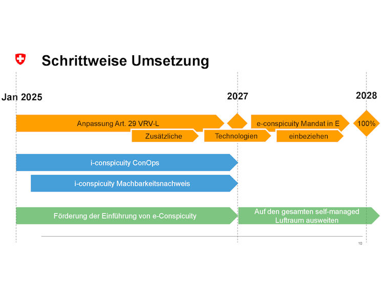 - Ausweitung der Transponder-Verpflichtung im Luftraum E auf eine e-conspicuity-Verpflichtung. Dabei kommen zunächst Mode-S-Transponder zum Einsatz (mit ADS-B Out für neue Installationen), und neue Technologien wie ADS-L werden einbezogen, sobald diese von Nutzenden und der Industrie validiert worden sind.