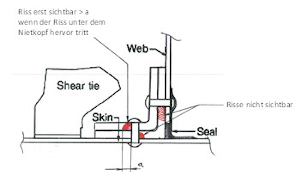 Bei den Riss-Prüfungen kommt weiter erschwerend hinzu, dass je nach Konstruktion ein Riss erst ab einer bestimmten Länge sichtbar wird oder nur durch spezielle Methoden (z. B. Eddy Current Inspection) ‹sichtbar› oder erkennbar wird. Dabei kann es auch erforderlich werden, an ‹kritischen› Stellen Bolzen oder Nieten für die Rissprüfung zu