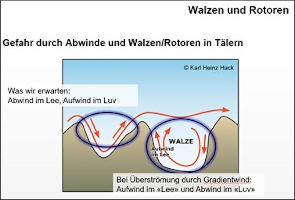 Strömt ein Gradientwind (Windströmung aufgrund eines Druckunterschiedes) quer zu einem Alpental, so erwarten wir Abwind im Lee und Aufwind im Luv. Wenn nun aber dieser Gradientwind aufgrund einer speziellen Schichtung der Atmosphäre (Stichwort Kaltluftsee im Tal) das Tal überströmt und nicht der Topografie folgt, so können sich im Tal kleine Windsysteme bilden, die durch den darüber strömenden Wind angetrieben werden. So befinden wir uns plötzlich in Abwindsituationen, wo wir eigentlich Aufwind erwarten. Auch hier, im Falle von starken Windenströmungen quer zum Tal, sind wir gut beraten, wenn wir nicht zu nahe der Topografie folgen und einen genügend grossen Abstand dazu einhalten.