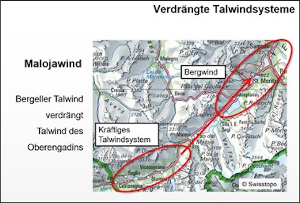 Jede Pilotin und jeder Pilot, die in der Schweiz die Ausbildung absolvieren, kennen den Maloya Wind, ein Windsystem, das eine Lee-Situation im Bereich des Flugplatzes Samedan erzeugt. In Unkenntnis dieses Windes ist dies schon vielen Piloten zum Verhängnis geworden. Was aber genau ist die meteorologische Ursache? Kurz gesagt verdrängt an einem Schönwettertag mit Tagesgang-Wetter das kräftige Bergeller Talwindsystem, das sich von Chiavenna Richtung Maloya-Pass aufbaut, den schwachen Talwind des Oberengadins zwischen Zernez und Maloya-Pass. Der Talwind wird also zu einem Bergwind, der vom Maloya-Pass Richtung Samedan bläst. Und so befinden wir uns kurz nach einem Start auf Piste 21 im Lee – in einem Downdraft, der die Steigperformance eines Kleinflugzeuges schnell einmal übersteigen kann. Als versierte Luftraumbenutzer wissen wir aber auch, dass mit einer entsprechenden Taktik dieser vermeintlichen Gefahr entgegnet werden kann: wir drehen nach dem Start in den Downwind – im Bewusstsein, dass wir kurzfristig sinken, aber dennoch konsequent unsere Lage und Geschwindigkeit halten – und gewinnen dadurch Höhe, bevor wir via Upwind mit genug Überhöhung Richtung Maloya-Pass weiterfliegen.