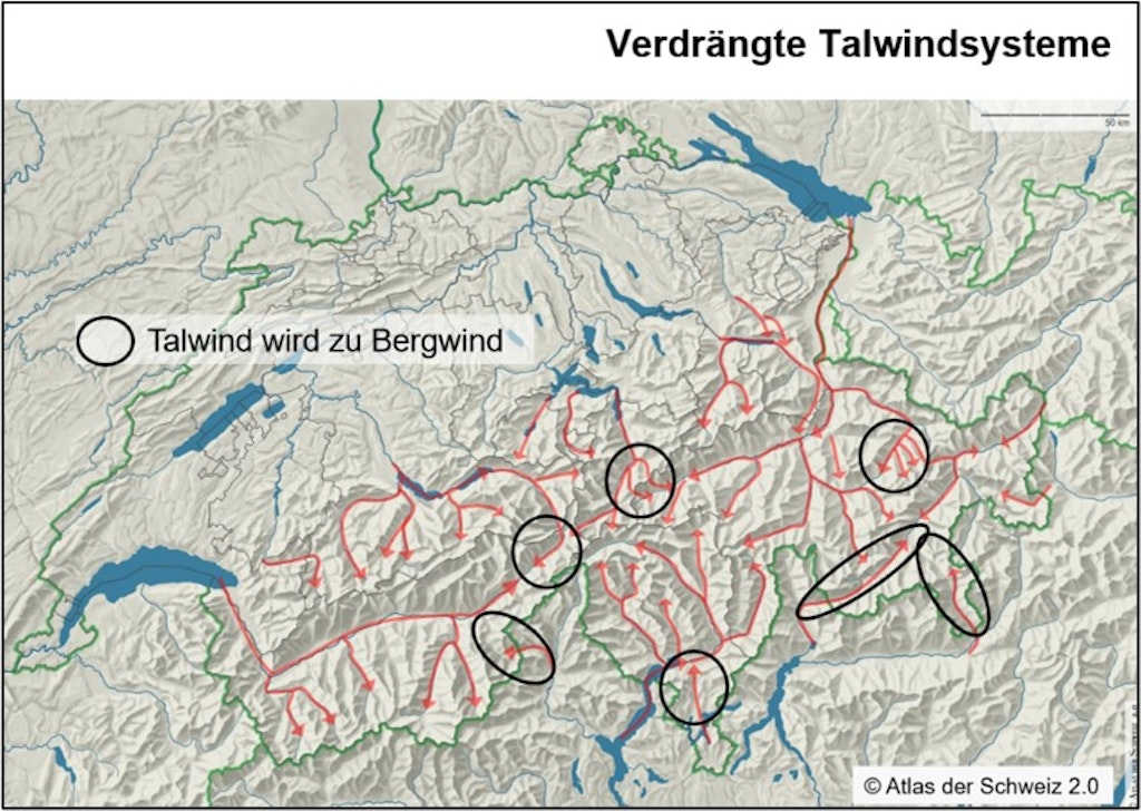 In diesem Zusammenhang ist zu erwähnen, dass diese Situation, bei der ein Talwind zu einem Bergwind wird, bei einigen weiteren Passübergängen vorkommt. Diese auf Passhöhe aufeinandertreffenden Alpentäler können unterschiedlich ausgerichtet sein, verscheiden breit und tief sein und mit unterschiedlichem Bewuchs respektive Stein und Fels ausgestattet sein. Schlussendlich führt dies zu unterschiedlicher Einstrahlung und somit Erwärmung – was der Antrieb für den Talwind ist.