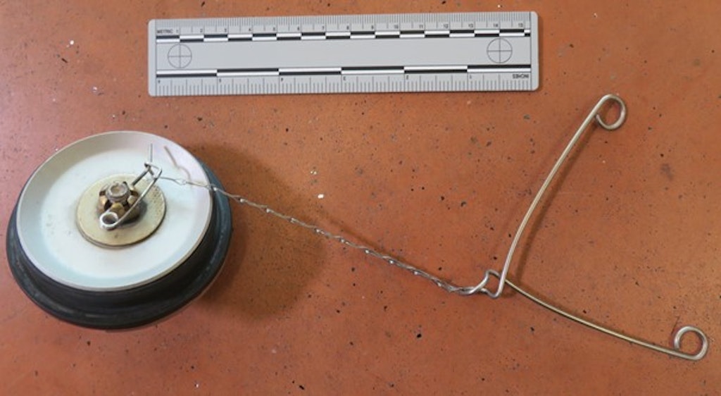Abbildung 2: Der noch vorhandene Tankdeckel vom zweiten Flügeltank (Sicht auf Unterseite) mit Sicherungskette und verbogener Spreizfeder.