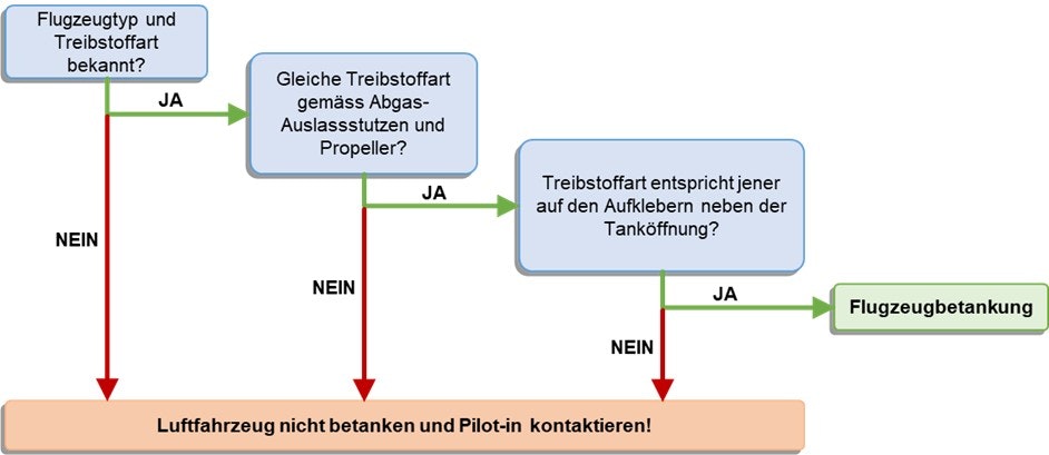 Um zu bestimmen, welchen Treibstoff ein Luftfahrzeug benötigt, sollte nicht nur ein einziges Element wie der Flugzeugtyp oder die Treibstoffkennzeichnung berücksichtigt werden, sondern eine Kombination verschiedener, relevanter Informationen. Bestehen Zweifel über die Art des zu verwendenden Treibstoffs, muss die Situation vor dem Betankungsvorgang geklärt werden.