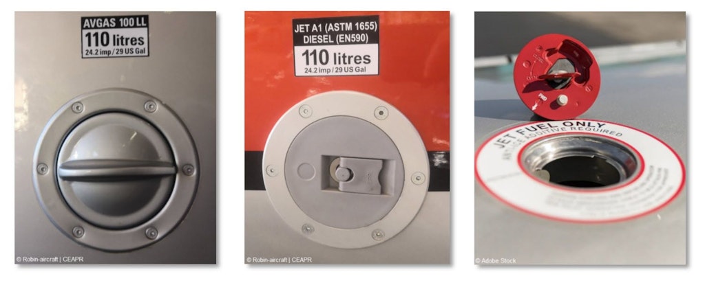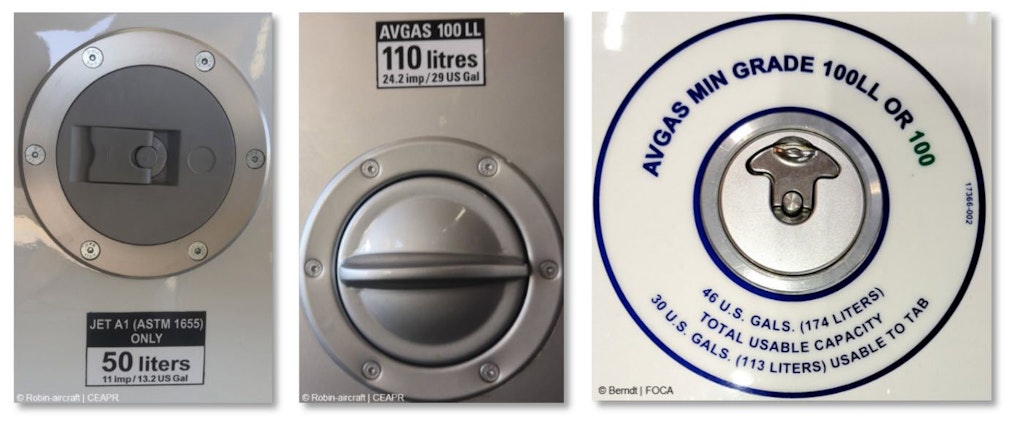 Der erste Tankdeckel gehört gemäss Aufkleber zu einem Flugzeug, das mit Jet A-1 betrieben wird. Die beiden anderen Deckel sind Beispiele, welche bei Flugzeugen, die AvGas 100LL benötigen, anzutreffen sind.