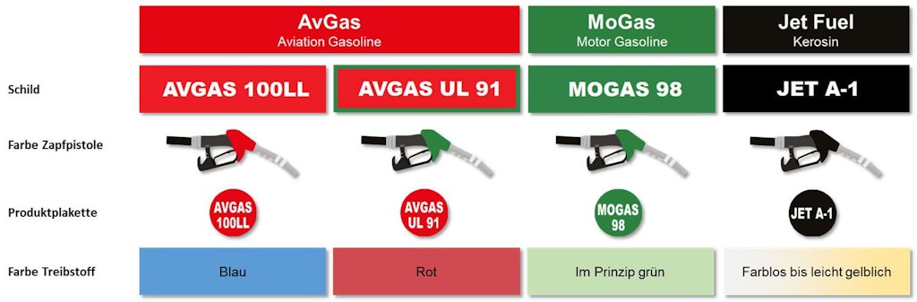Die Aufkleber neben der Tanköffnung haben jedoch nicht immer die gleiche Farbe wie die Zapfpistole. Aus diesem Grund müssen Pilotinnen und Piloten oder das Betankungspersonal überprüfen, welcher Treibstoff gemäss der Inschrift des Aufklebers benötigt wird.