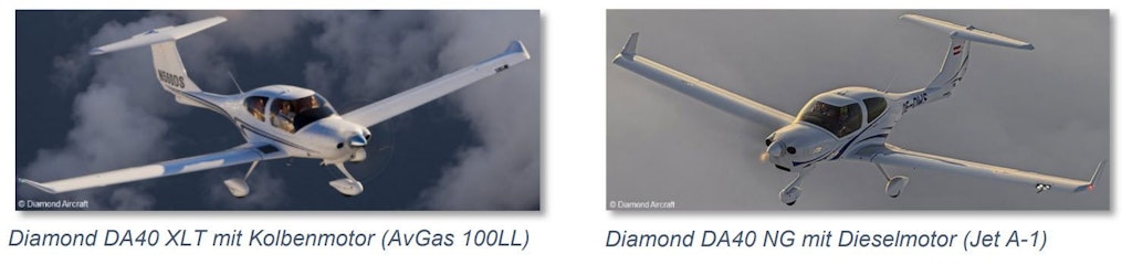 Ein weiteres Beispiel sind die beiden Modelle der DA40, die sich äusserlich normalerweise unterscheiden. So verfügt die DA40 NG über vertikale Winglets und einen rechteckigen Lufteinlass und wird mit Jet A-1 betrieben. Daneben gibt es allerdings auch eine DA40 D, die ebenfalls Jet A-1 benötigt, jedoch die gleichen äusseren Merkmale (schräge Winglets und dreieckiger Lufteinlass) aufweist wie die DA40 XLT, die wiederum mit AvGas 100LL betankt werden muss.