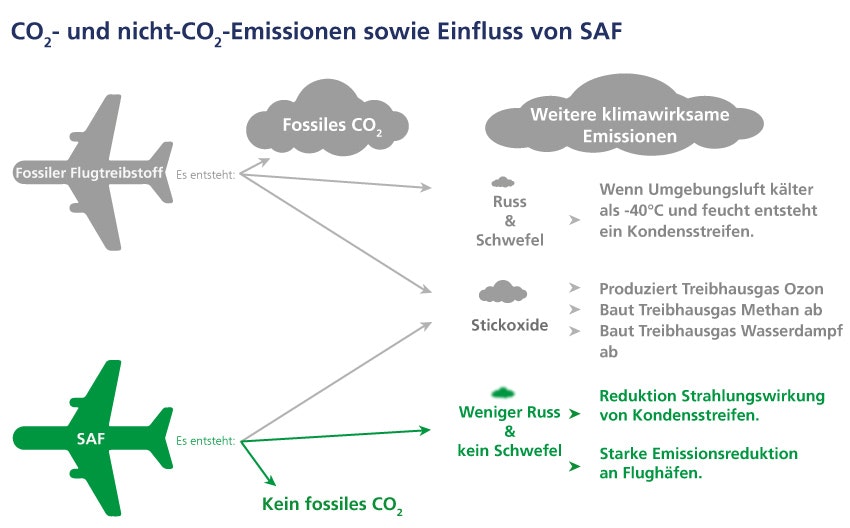 - SAF reduzieren CO2- und andere Klimaeffekte wie die Bildung von Kondensstreifen.
