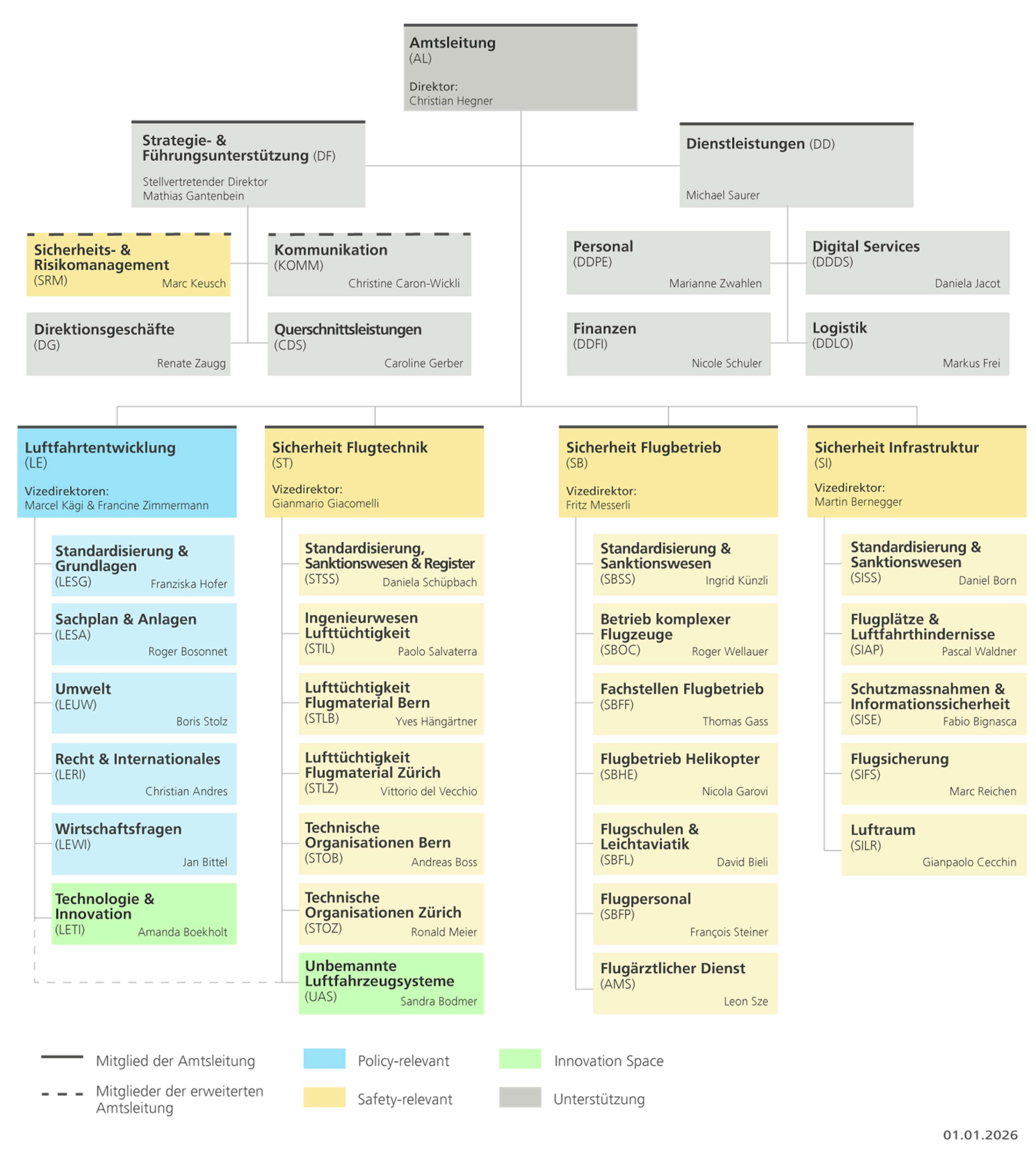 Die Struktur des BAZL unterscheidet klar zwischen Aktivitäten, welche die Sicherheit der Zivilluftfahrt betreffen und den Aktivitäten, welche die Luftfahrtpolitik betreffen. Diese Struktur erlaubt es dem BAZL zukunftsgerichtet und effektiv die Aufgaben als Zertifizierungs- und Aufsichtsbehörde wahrzunehmen und seine Funktion als Regulierungsbehörde im nationalen und internationalen Rahmen auszuüben. Weiter nimmt das BAZL eine zentrale Rolle bei der Entwicklung der schweizerischen Luftfahrtpolitik ein.