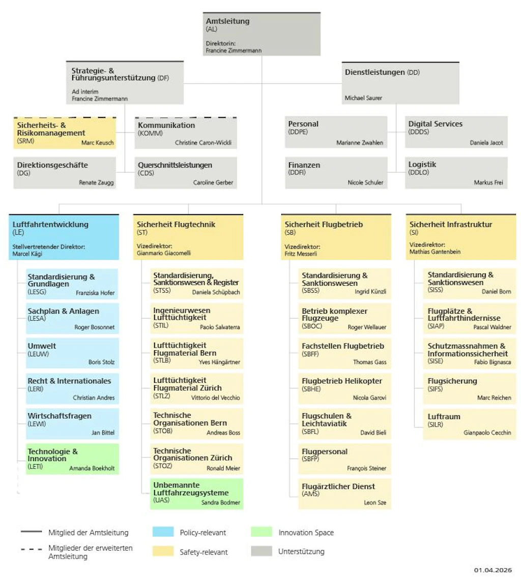 Die Struktur des BAZL unterscheidet zwischen Aktivitäten zur Sicherheit der Zivilluftfahrt und Luftfahrtpolitik. Diese Struktur erlaubt es dem BAZL, zukunftsgerichtet und effektiv die Aufgaben als Zertifizierungs- und Aufsichtsbehörde und seine Rolle als Regulierungsbehörde im nationalen und internationalen Rahmen wahrzunehmen.