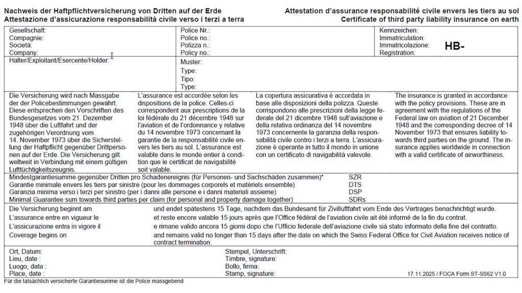 Für den Betrieb hat jeder Halter eines im schweizerischen Luftfahrzeugregister eingetragenen Luftfahrzeuges als Nachweis der Sicherstellung der Haftpflichtansprüche Dritter auf Erden den Versicherungsnachweis (BAZL Form 50.042.0) vorzulegen. Besteht eine Haltergemeinschaft so muss jeder eingetragene Halter auf dem Haftpflicht- und Passagierversicherungsnachweis aufgeführt sein. Der Versicherungsnachweis muss den geltenden gesetzlichen Vorschriften entsprechen und durch eine zugelassene Versicherungsgesellschaft ausgestellt und unterschrieben werden. Kann kein Versicherungsnachweis vorgewiesen werden, ist eine Zulassung zum Verkehr nicht möglich.