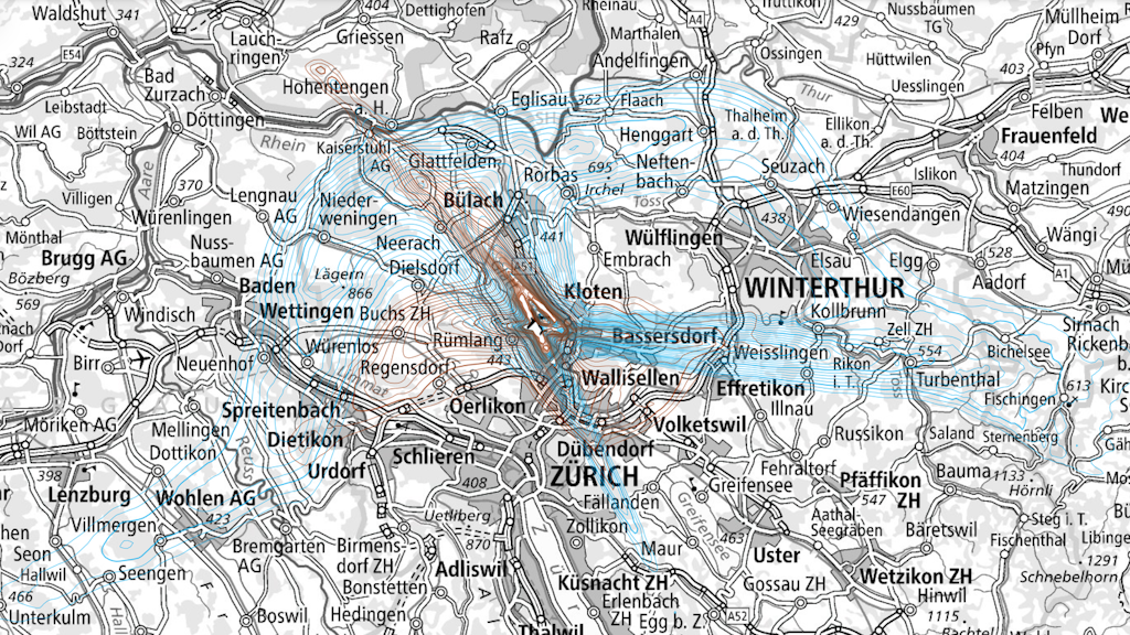 Swiss environmental legislation requires that noise curves be drawn up for aerodromes emitting a certain level of noise pollution. The resulting maps are used to help keep noise pollution from aviation to a minimum.