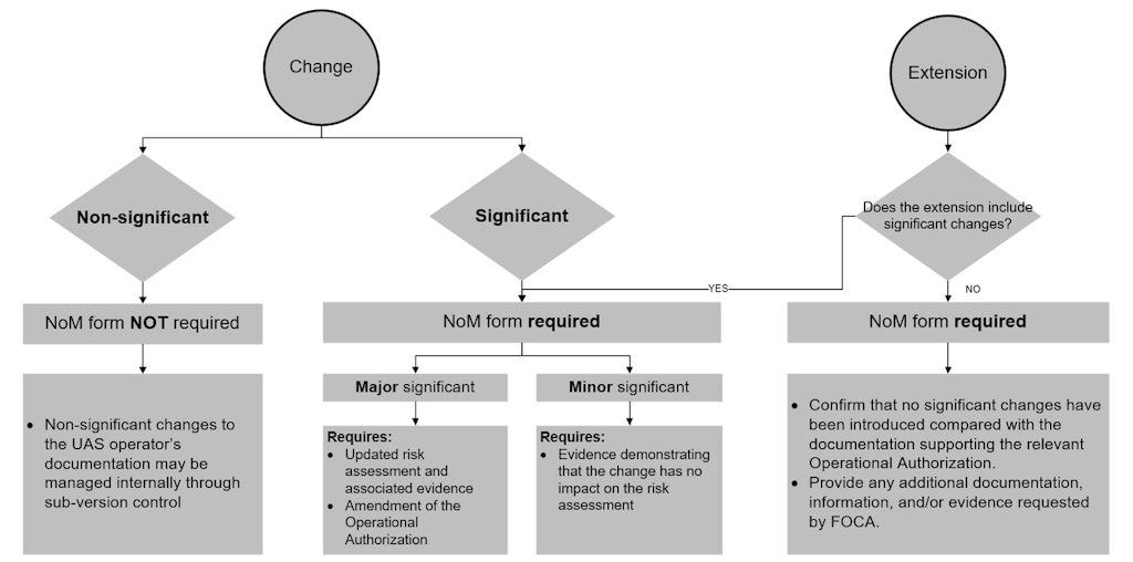 This webpage is intended for UAS operators who hold an active Operational Authorization issued by FOCA based on a Predefined Risk Assessment (PDRA) or a Specific Operations Risk Assessment (SORA), as well as for operators holding an active Confirmation of Acceptability (CoA) issued by FOCA in accordance with Article 13 of Regulation (EU) 2019/947 for cross-border operations.