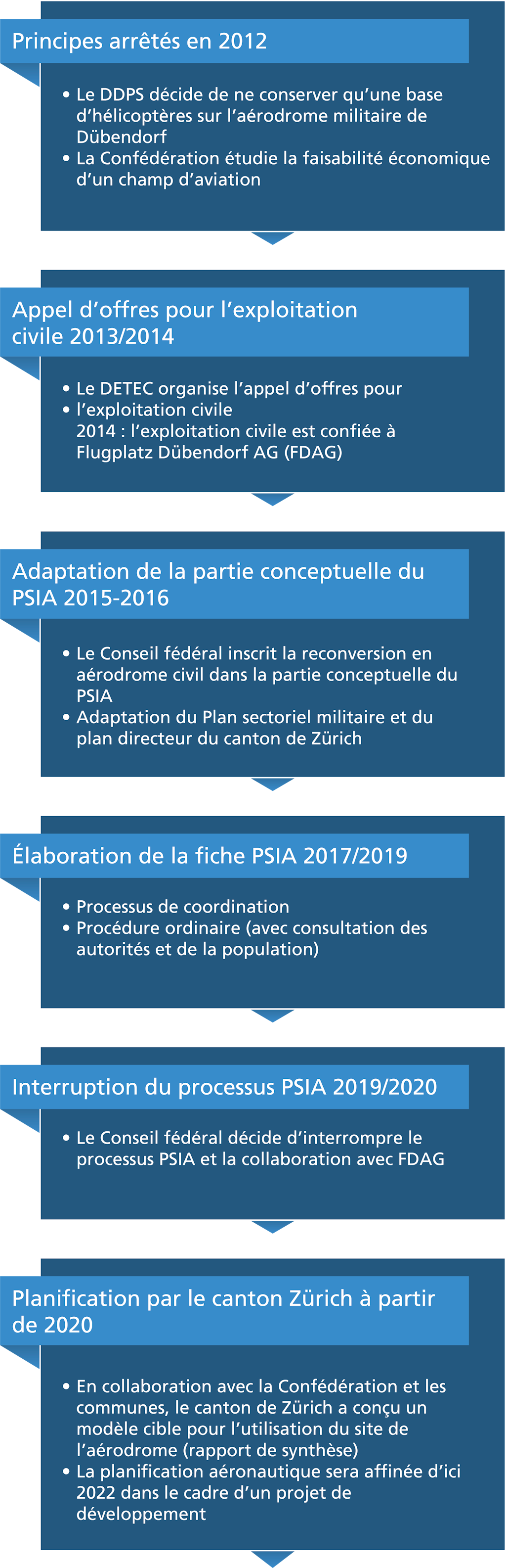 En 2014, le Conseil fédéral avait décidé d'utiliser à l'avenir l'aérodrome militaire de Dübendorf comme champ d'aviation civil. Suite à l’émergence de problèmes imprévisibles au cours des travaux de planification et à la modification de la situation de départ qui en a résulté, en octobre 2020 le Conseil fédéral a décidé d’interrompre la procédure de planification sectorielle en cours. Par la suite, le Canton de Zurich a lancé une nouvelle planification de toute la zone de l’aérodrome.