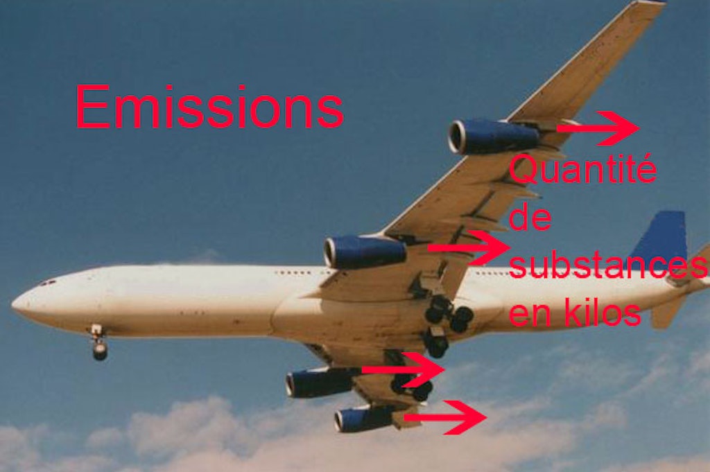 Dans le cas des avions, les émissions désignent les polluants résultant de la combustion du kérosène et rejetés dans l’atmosphère par les moteurs. Les émissions sont mesurées en kilos ou en tonnes.