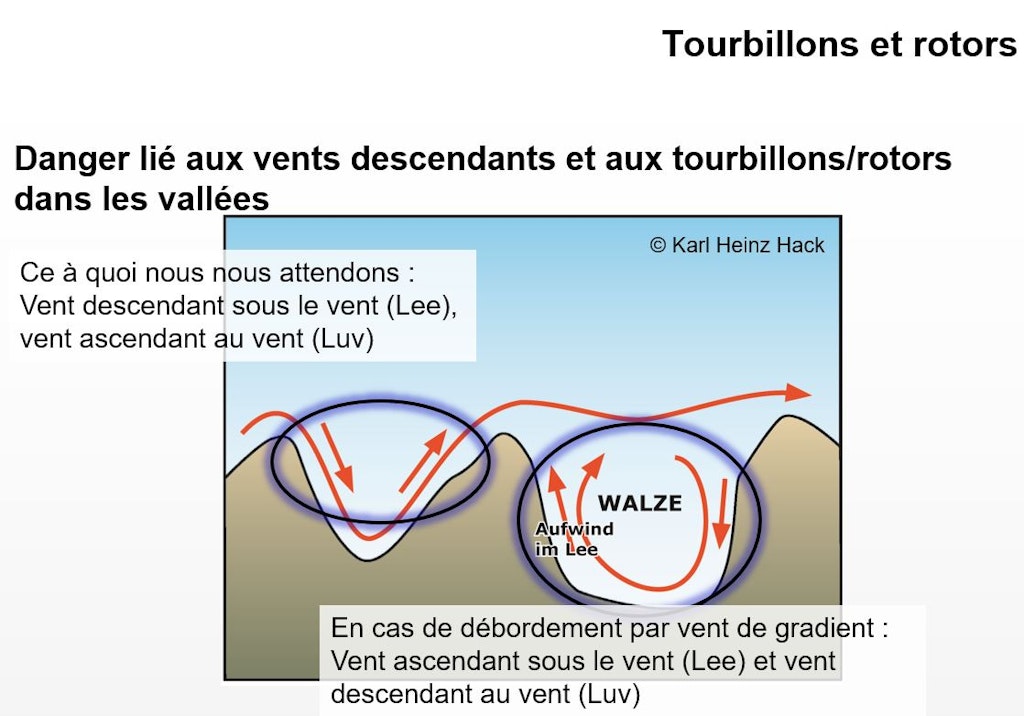 Lorsque le vent de gradient (vent généré par les variations de pression atmosphériques) circule perpendiculairement à une vallée alpine, le vent descendant est sous le vent tandis que le vent ascendant est au vent. Or, en fonction de la stratification de l’atmosphère (lac d’air froid dans la vallée), il peut arriver que le vent de gradient ne suive pas le relief mais souffle au-dessus de celui-ci, ce qui conduit à la formation en fond de vallée de petits régimes de vent alimentés précisément par le vent qui souffle au-dessus. Il en résulte des vents descendants là où on s’attendrait plutôt à rencontrer des vents montants. En cas de forts courants perpendiculaires à une vallée, les pilotes seront bien inspirés de ne pas suivre exactement le relief et de maintenir une distance de sécurité suffisante.