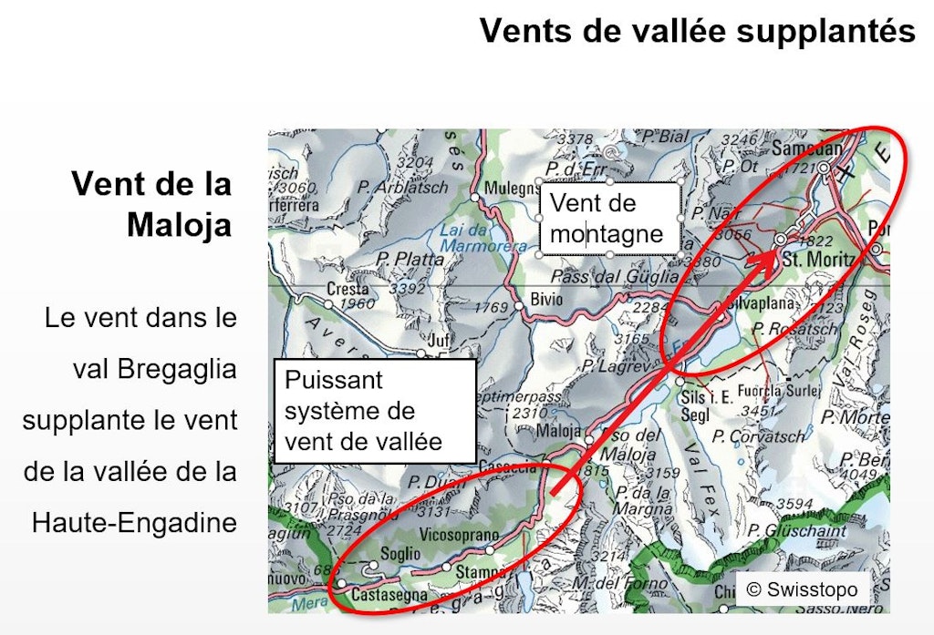 À noter que ce phénomène n’est pas propre à la Maloja et concerne aussi d’autres cols. Dans les Alpes, les vallées unies par un col diffèrent selon leur largeur, leur profondeur, leur végétation et leur géologie. Ces facteurs ont une influence sur le rayonnement et le réchauffement qui sont à l’origine du vent de vallée.