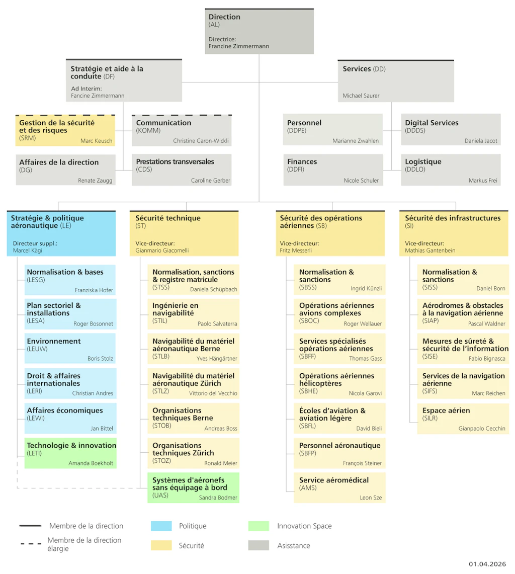 La structure de l'office fait une distinction stricte entre les activités liées à la sécurité de celles spécifiques à la politique aéronautique. Cette répartition permet à l'institution d’assurer d’une manière proactive et efficace les fonctions d’autorité d’approbation et de surveillance ainsi que le rôle de régulateur dans le cadre des réglementations suisses et internationales. L’OFAC occupe ainsi une place de choix dans l’élaboration de la politique aéronautique du pays.