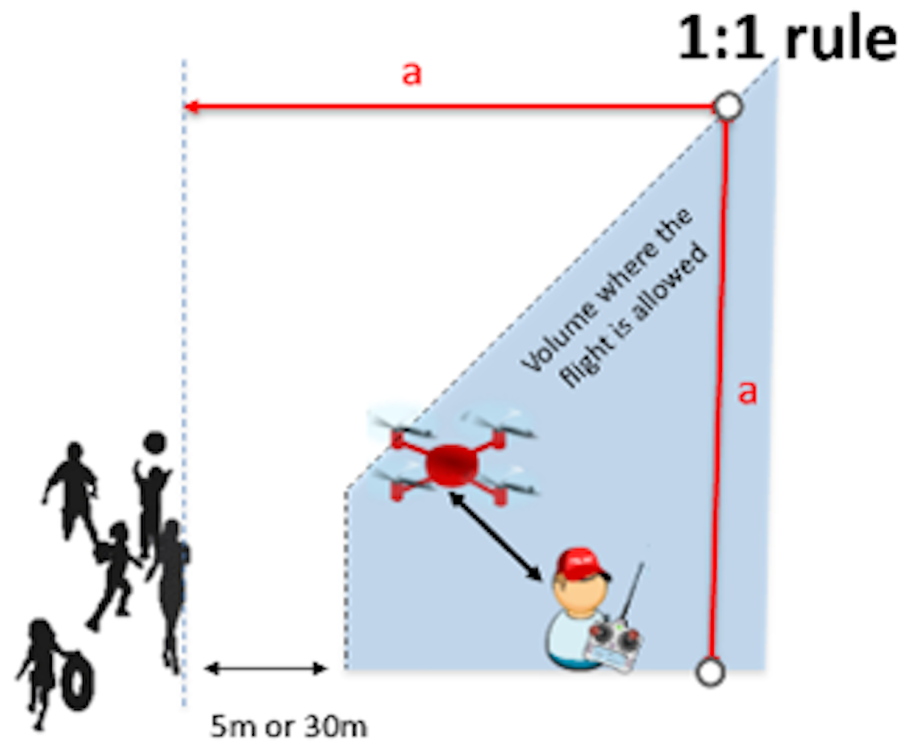 Exemple : lorsqu’un drone vole à une hauteur de 40 m, la distance horizontale par rapport aux personnes ne participant pas à l’exploitation doit au moins correspondre à 40 m. Par contre, si le drone vole à une hauteur de 20 m, la distance horizontale par rapport aux personnes ne participant pas à l’exploitation doit au moins correspondre à 30 m.
