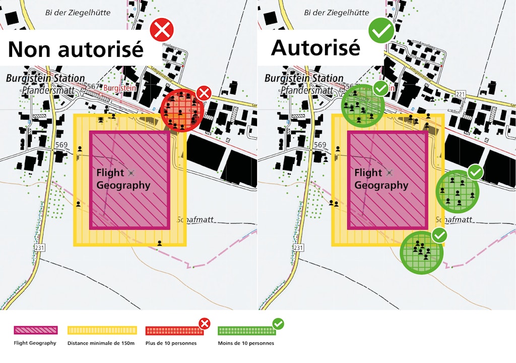 L'exploitation est effectuée dans une zone où aucune personne ne participant pas à l’exploitation ne sera mise en danger dans le rayon d'action du drone. Il est de la responsabilité du ou de la télépilote d'évaluer la zone qui sera survolée en procédant à une inspection sur le terrain avant et pendant l'’exploitation, et de déterminer si les conditions d'exploitation sont conformes aux limitations susmentionnées. Le télépilote doit donc respecter une distance horizontale minimale d'au moins 150 m par rapport aux zones dans lesquelles se trouvent - au moment du vol - au moins 10 personnes ne participant pas à l’exploitation dans un rayon de 100 m.