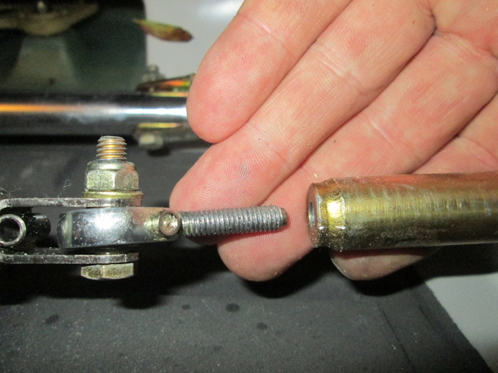 Il convient à cet effet d'ôter le cache de la commande d'aérofrein à l'arrière du cockpit et de vérifier que la rotule et son raccord (fileté à gauche) ont correctement été montés (voir photo). Le raccord doit être solidement fixé et ne doit pas être endommagé. Ce contrôle s'effectue sans démonter la biellette.