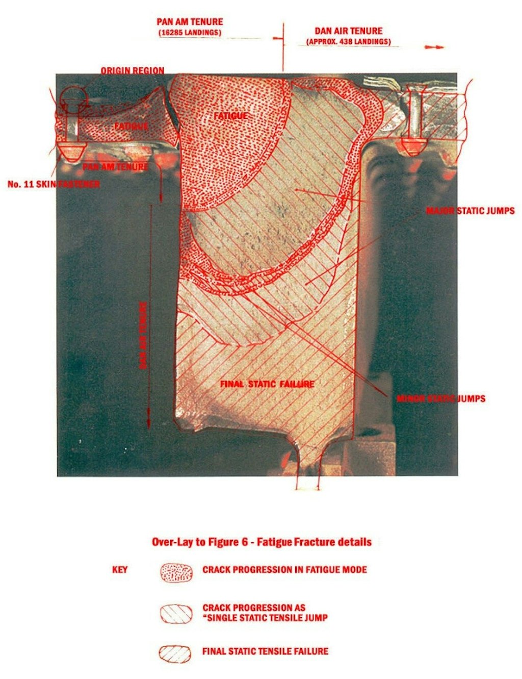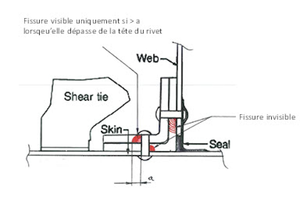 À ces difficultés s’ajoute le fait qu’en fonction de la conception de l’avion, les fissures ne sont « visibles » ou décelables qu’après un certain temps, voire en faisant usage de méthodes spéciales (p. ex. Eddy Current Inspection). Il peut être parfois nécessaire d’ôter les rivets ou les boulons pour l’inspection.