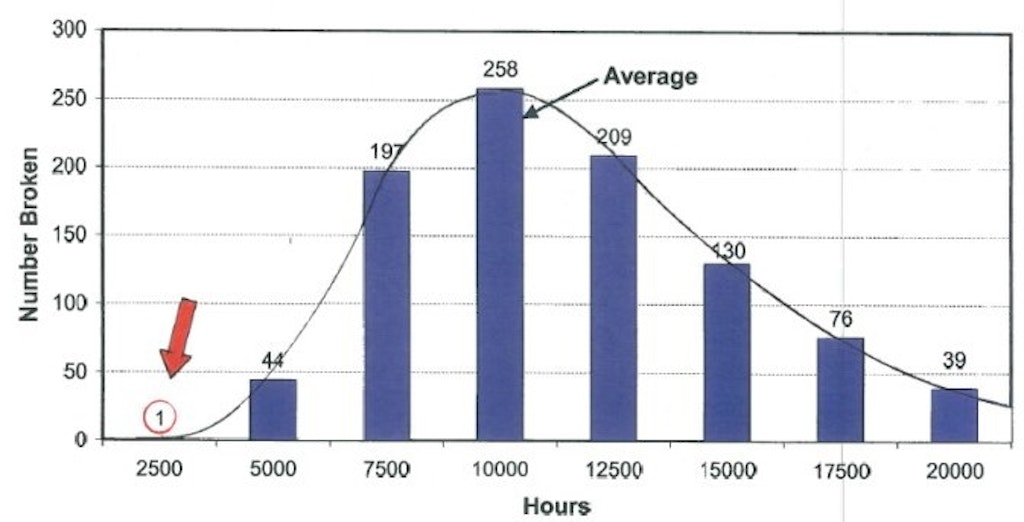 Comment évolue la durée de vie (fatigue) d’éléments de fabrication identique soumis aux mêmes variations de charge (spectre de charge uniforme) ? Pour le savoir, on a testé la durée de vie de 1000 longerons de fabrication identique en les soumettant aux mêmes sollicitations jusqu’à l’apparition d’une rupture de fatigue. Le niveau de contrainte des longerons a été déterminé par analyse et devait permettre en principe à l’élément de supporter 10 000 heures de vol. Les résultats de l’essai sont représentés dans le diagramme suivant :
