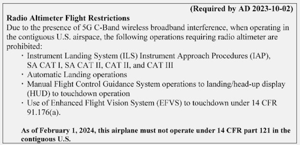 La nuova AD distingue tra «radio altimeter tolerant airplane», ossia aeromobili che tollerano i trasmettitori 5G e non sottostanno più ad alcuna restrizione, e «non-radio altimeter tolerant airplanes», per i quali invece nell’Airplane Flight Manual deve ancora figurare una restrizione.