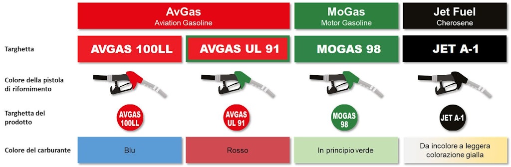 Tuttavia, gli adesivi apposti accanto al bocchettone del serbatoio non sono sempre dello stesso colore della pistola. È quindi necessario che il pilota o l’addetto al rifornimento verifichi il tipo di carburante riportato sull’adesivo.