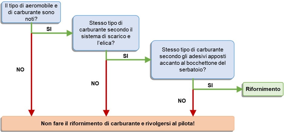 - Il personale addetto al rifornimento deve essere formato per distinguere le caratteristiche specifiche di un motore aeronautico a benzina o a cherosene. Prima di iniziare il rifornimento deve controllare ogni volta le etichette apposte sull’aereo che indicano il tipo di carburante. In caso di rifornimento, per gravità gli addetti devono sempre operare in presenza del pilota.