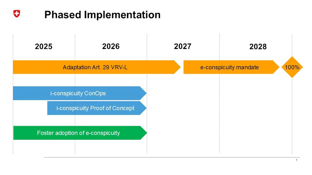 - Introdurre un obbligo di e-conspicuity in Svizzera. Questa misura considera l'uso di transponder «Mode S» come anche tecnologie di trasmissione (ADS-B OUT e ADS-L Out) per garantire un approccio pragmatico e equilibrato confacente alle diverse esigenze di visibilità.