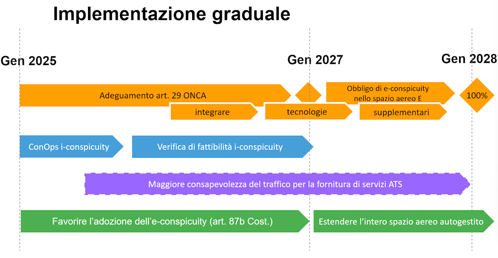- Promuovere tecnologie di e-conspicuity per facilitarne l’introduzione nell’aviazione generale e garantire la piena visibilità nello spazio aereo di classe E e G.