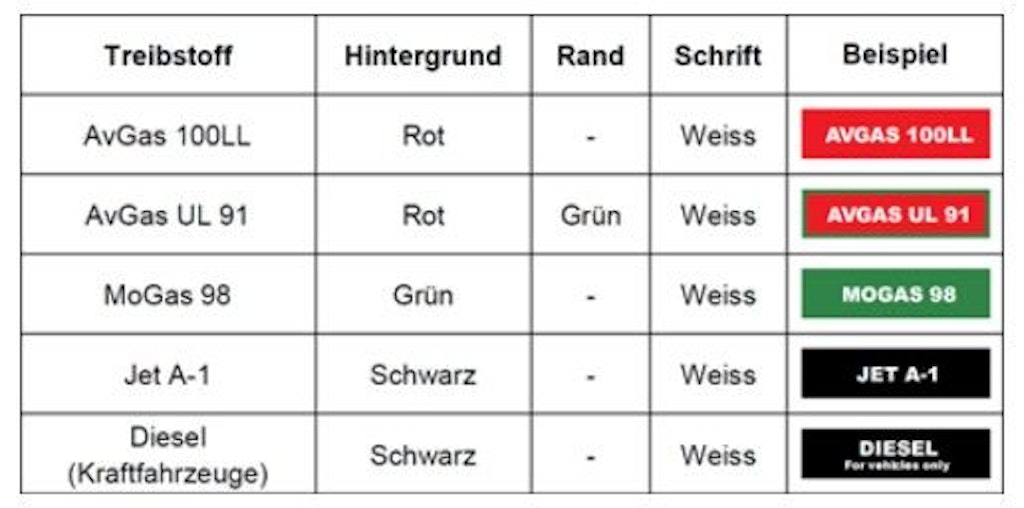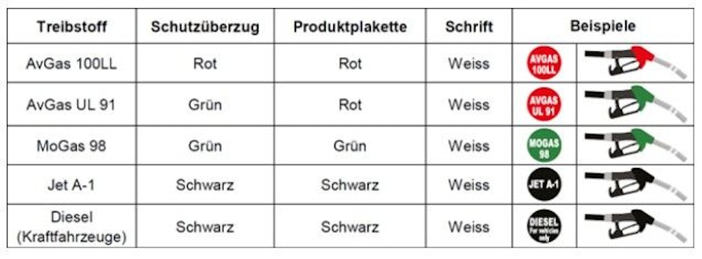 Per evitare errori nella scelta del carburante durante il rifornimento degli aeromobili, in virtù della norma internazionale EI Standard 1542 (eccezione per AvGas UL 91), le pompe fisse degli impianti e dei veicoli di rifornimento devono essere contrassegnate dai seguenti colori.