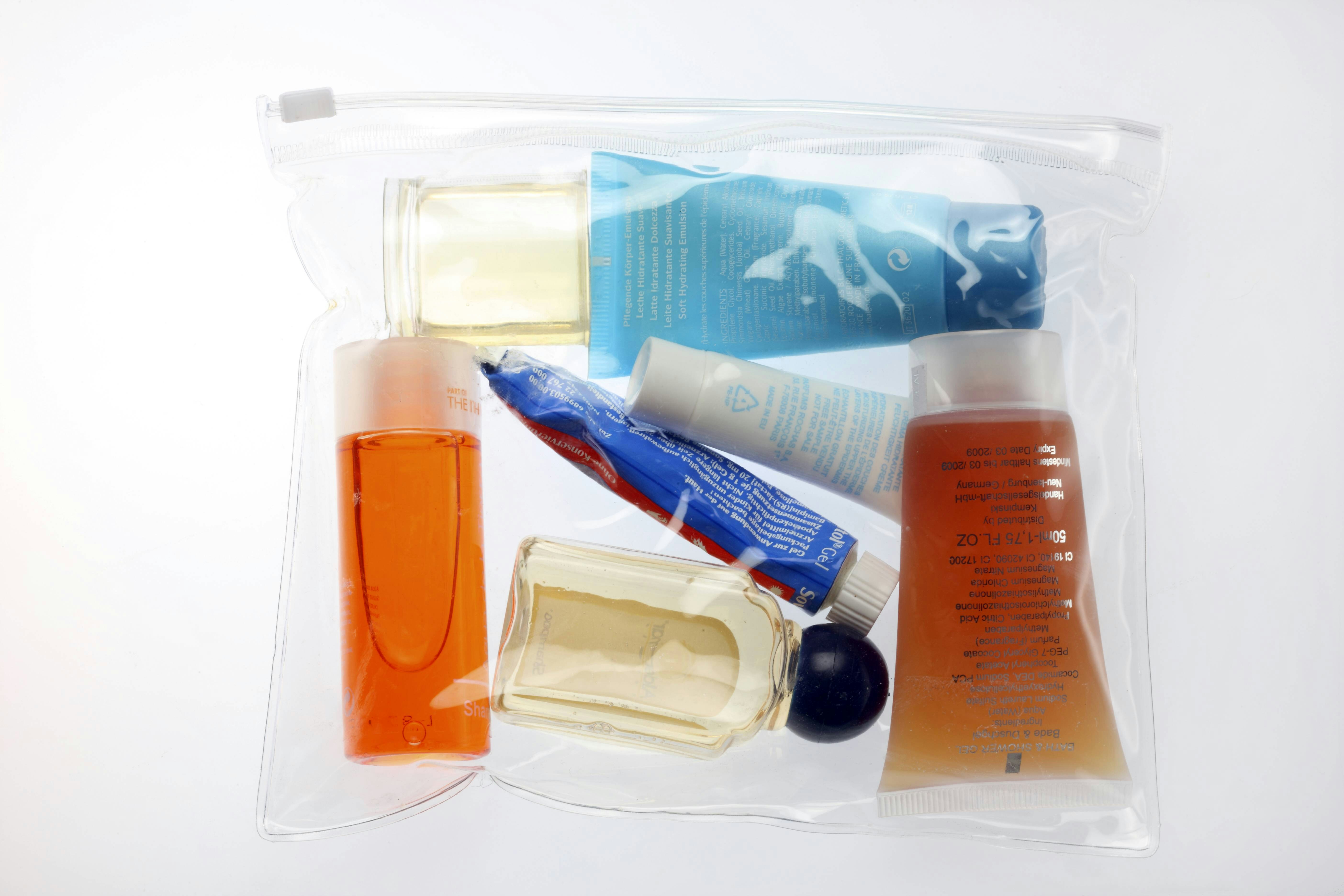 - Contenitori con liquidi, aerosol o gel aventi una capacità massima di 100 ml (1 dl). I contenitori (tubetti, vasetti, flaconi) devono poter essere inseriti agevolmente in un sacchetto di plastica trasparente e richiudibile (per es. un sacchetto per congelare i cibi) di capacità non superiore a 1 litro. Per ogni passeggero (bambini e neonati compresi) è consentito il trasporto di un solo sacchetto di plastica.